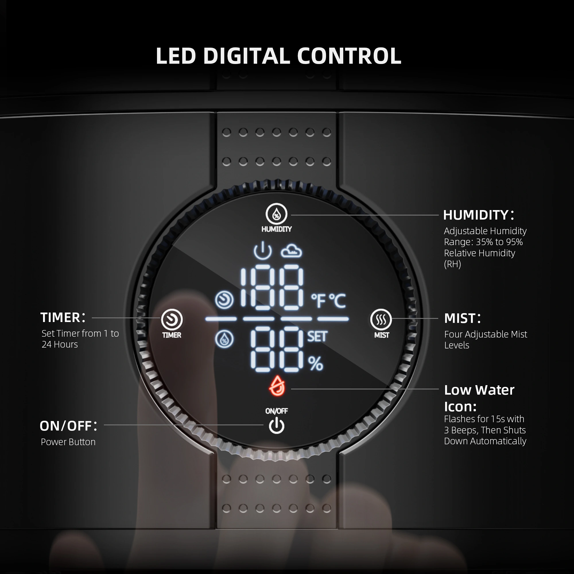 Mit einem 5-Liter-Tank ermöglicht der Humidifier lange, kontinuierliche Laufzeiten ohne ständiges Nachfüllen. Trotz einer starken Befeuchtungsleistung von bis zu 450 ml pro Stunde arbeitet das Gerät mit weniger als 30 dB besonders geräuscharm – ideal für Wohnräume oder diskrete Grow-Setups.